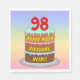 This joyful and fun birthday themed paper napkin design features a cartoon-style depiction of a three-tier birthday cake having numeral-shaped candles on top showing the number “98“, along with the message “HAPPY 98TH BIRTHDAY,”, and a customisable recipient name. The background features a multicolored pastel rainbow spectrum inspired gradient pattern. Upbeat birthday themed paper napkins like these might be used at a birthday party in celebration of somebody’s ninety eighth birthday. [~Z0000623]