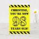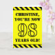 The front of this bold and attention-grabbing birthday themed greeting card design features a custom name and the message "YOU’RE NOW 98 YEARS OLD!" in black stencil inspired text on a yellow colored background. There is also an eye-catching yellow and black stripes pattern at the top and bottom edges of the front. The inside features a customizable birthday greeting message, or could perhaps be cleared and left blank if a message is to be written by hand instead. A personalized birthday card like this might be a fun way to send birthday wishes to somebody who is celebrating their ninety eighth birthday. [~Z0000413]