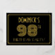 The front of this vintage-look ninety-eighth birthday celebration/party foil invitation features an editable name, a large art deco style inspired number “98TH”, the message “BIRTHDAY PARTY!”, and a border pattern consisting of lines. The background of the front is coloured black by default, but it can be customised to a different colour if desired. The back features personalised details about the event, such as the date, time, location, and any other information that may be relevant. Elegant, luxurious, customisable invitations like these might be used to invite guests to a birthday celebration/party being held to honour somebody’s 98th birthday. [~Z0000590]