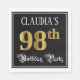 This fancy and ornate birthday themed paper napkin design features a personalized name and the message “98th Birthday Party”. The large number “98th” has a faux/imitation gold-inspired coloring pattern, and the words “Birthday Party” are in luxurious script-style text. The background is colored black by default (although it can be customized). Elegant, opulent paper napkins like this might be used at a birthday party being held in celebration of somebody’s 98th birthday. [~Z0000565]