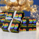 This fun, cheerful, and colourful birthday-themed wrapping paper design features a large number "99" and the message "HAPPY BIRTHDAY,", both having a rainbow spectrum gradient inspired pattern colouring, along with a bold yellow editable recipient name. The background is coloured black. Fun birthday themed wrapping paper like this might be used when giving a gift or present in celebration of somebody’s ninety ninth birthday. [~Z0000475]