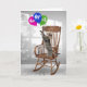 Playful tabby cat standing on a wooden rocking chair and reaching for a colourful balloon bouquet for 99th birthday.