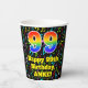 This cheerful and exciting music themed birthday paper cup design features a large number “99” with a rainbow spectrum gradient inspired pattern, along with the message “Happy 99th Birthday,”, and a customisable name. The background features a multicolored pattern having music notes and symbols of various colours and sizes. Colourful, vibrant paper cups like this might be fun to use at a birthday party/celebration being held to honour somebody’s ninety ninth birthday. [~Z0000541]