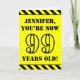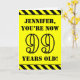 The front of this attention-grabbing and bold birthday themed greeting card design features a customizable name and the message "YOU’RE NOW 99 YEARS OLD!" in black stencil style text on a yellow colored background. There is also an eye-catching black and yellow striped pattern at the top and bottom edges of the front. The inside features a personalized birthday greeting message, or could perhaps be cleared and left blank if a message is to be written by hand instead. A personalized birthday card like this might be a fun way to acknowledge somebody’s ninety ninth birthday. [~Z0000413]