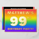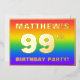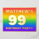 The front of this fun and exciting ninety-ninth birthday celebration foil invitation card design features a customisable name, a large number “99th”, the message “BIRTHDAY PARTY!”, and a border. The background of the front has a joyful, multicolored, rainbow spectrum inspired gradient pattern. The back features personalised details about the event, such as the date, time, location/venue, and any other relevant information. Customisable invitations like these might be a fun way to invite attendees to a birthday gathering/party being held to honour somebody’s 99th birthday. [~Z0000599]