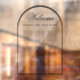 A simple transparent seating chart inside a modern arch frame. The text and the frame are black. The Welcome is written in an elegant script.