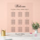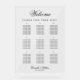 A simple but elegant transparent seating chart with 9 tables in 3 rows and 3 columns, recommended for a minimalist wedding. The title "Welcome" above and the names of the bride and groom below are written in an elegant calligraphy, the rest in caps. All text is black.