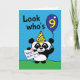 Our sweet little panda friend is wishing a special little boy a happy 9th birthday! In one hand, he's holding a handmade birthday card that says "Happy Birthday" with a cute red heart. In the other hand, he's holding a bright blue balloon (with a big yellow number 9). Card background is fun swirls on light blue. Original illustration by Bethany J. Mitchell of Darcy Place Studio.