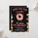 Doughnut lose your sprinkles but it's my 9th birthday! A unique personalised birthday invitation with an array of tasty doughnuts and a Kawaii doughnut illustration. Customise it with all of your birthday event details. The backside features a colourful sprinkle collage with a black background. Great for girls turning nine years old!