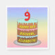 This upbeat and cheerful birthday themed paper napkin design features a cartoon-style depiction of a three-tier birthday cake having a numeral-shaped candle on top showing the number “9“, along with the message “HAPPY 9TH BIRTHDAY,”, and a customisable recipient name. The background has a multicolored pastel rainbow spectrum inspired gradient pattern. Colourful birthday themed paper napkins like these might be used at a party for somebody who is celebrating their ninth birthday. [~Z0000623]