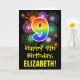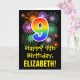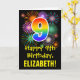 The front of this exciting, fun, and colourful birthday-themed greeting card design features a large number "9" with a rainbow spectrum gradient inspired pattern, along with the message "Happy 9th Birthday,", and a custom recipient name. The front additionally features a colourful background pattern inspired by bursting celebratory fireworks. The inside features a customisable birthday greeting message, or could perhaps be cleared and left blank if a message is to be written by hand instead. A customisable birthday card like this might be a fun way to send a message celebrating somebody’s ninth birthday. [~Z0000442]