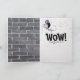 Golden retriever wearing a funny moustache mask on grey brick wall and wood floor with speech bubble for 9th birthday.