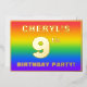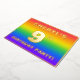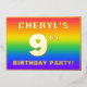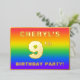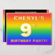 The front of this joyful ninth birthday party foil invitation card design features a custom name, a large number “9th”, the message “BIRTHDAY PARTY!”, and a border. The background of the front has a vibrant, colourful, rainbow spectrum inspired gradient pattern. The back features personalised details about the event, such as the date, time, place, and any other relevant information. Personalised invitations like these might be a fun way to invite guests/attendees to a birthday gathering being held in celebration of somebody’s 9th birthday. [~Z0000599]