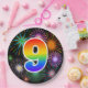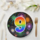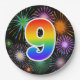This cheerful, colourful, and fun paper plate design features a large number "9" containing a rainbow spectrum gradient inspired pattern colouring. It also features a exciting and vibrant bursting celebratory fireworks inspired pattern. The background is coloured black. Fun paper plates like this might be used at somebody’s ninth birthday party, a ninth anniversary celebration, or some other ninth event. [~Z0000490]
