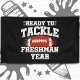 This fun freshman year design is perfect for a high school freshman football player or 9th grade teacher that loves to support their high school football team! Perfect for back to school, 8th grade graduation or all school year long! Features 'Ready To Tackle Freshman Year' high school freshman quote w/ football graphic. Great for a 9th grader or ninth grade teacher that loves to watch or play football!