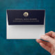 Deliver your note cards, thank you notes, and correspondence in style with our A2 envelopes with gold seal logo and return address on the back flap of the envelope. An elegant professional brushed metallic gold logo envelope with rich navy blue back flap and interior. Make a statement from the moment your mail is received.