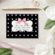 COLOR PALETTE: black, and pink. DESIGN COLLECTION: This Bat Mitzvah Invitation matching RSVP response card return envelope features elegant French copperplate calligraphy typographic calligraphic swirls, pink and green dots in the background and a beautiful hand painted pink bow. A hand painted "sheered" look ribbon with black dot border and black stripes makes a great feminine design. All made from original artwork by Audrey Jeanne Roberts. The result is a beautifully contemporary typography design ensemble. On the reverse side there is the same dot pattern and a bracket with your invitation event wording that is easily customised via the template fields. If you need assistance to fit your wording in the invitation, simply send us a message via the link and we'll be happy to help out.