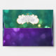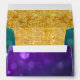 A7 Envelopes designed to coordinate with a wide range of wedding invitations, party invites, bridal and baby showers, thank you notes and announcements. An hand drawn scroll swirl curly cue frame in gold metallic look glitter is on the front for you to write or print the address you're sending it to and on the back flap a similar coordinating shape for your preprinted return addresses. (NOTE: THIS IS A FLAT PRINTED INVITATION THERE IS NO ACTUAL GLITTER OR GOLD METALLIC INKS USED) A hand made bokeh twinkling lights sparkle shimmer image in peacock colours is the outside colour - purple, violet, blue, persian blue fading to green. Inside is a multi-colour and size gold glitter image. Graphically designed by Audrey Jeanne Roberts