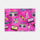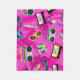 A fleece blanket that is comfy and cosy, this 80's inspired retro design features a lively pink background with elements of that era such as colourful sunglasses, boom boxes, bright musical instruments, etc. There are also palm trees in the background also. Choose from three different sizes.