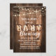 This rustic co-ed baby shower invitation is perfect for a backyard BBQ. It features string lights, wood and gingham. It is perfect for a casual, couples shower.