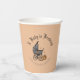 Personalised "A Baby is Brewing" Halloween Baby Shower paper cups, featuring hand-drawn baby carriage, crow and pumpkins against an elegant light orange background. Printed on Front and Back of the cup. Simply click on "Personalise this template" to insert your own name.