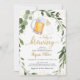 This invitation features watercolor greenery with a beer and baby bottle and gold foil accents.