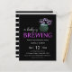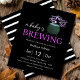 A captivating Halloween-themed baby shower invitation adorned with a whimsical cauldron, bursting with enchanting purple hues against a mysterious black backdrop. The invitation playfully proclaims, "A baby is brewing," inviting guests to join in the festive celebration. The reverse side showcases a stylish black and white striped pattern, adding a touch of elegance to this spooky yet delightful design.