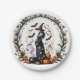 Celebrate the upcoming arrival of your little one with these enchanting paper plates. Featuring a vintage-style illustration of a pregnant witch in a floral starry gown, a bubbling cauldron with purple smoke, pumpkins, and elegant Halloween floral accents, these plates are the perfect mix of whimsical and spooky. Personalise it with your event details and impress your guests with a magical start to your celebration. Ideal for fall or Halloween-themed baby showers.