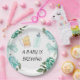 Blue a baby is brewing paper plate with blue flowers around the border.