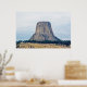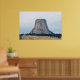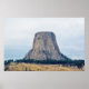 A photograph of a laccolithic butte known as, Devils Tower National Monument, towering over the landscape of rural Wyoming, one Summer day.