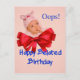 This design shows a toddler saying "Oops" with a gesture of surprise at not remembering your birthday. It is a humourous design for belated birthday occasion