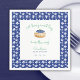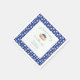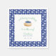 This is a customisable baby shower napkin with a charming blueberry theme. The design features a blue border adorned with white daisy-like flowers, framing a central white square. Inside the square, there is an illustration of a blueberry dessert with green leaves, adding a playful and sweet touch. The text, written in a mix of cursive and print fonts, reads: "A berry sweet boy is on the way!" Below, in a complementary font, it displays the honoree’s name and the event date. The napkin has a fresh, whimsical, and fun aesthetic, perfect for a blueberry or fruit-themed baby shower. It is customisable, allowing for the name and date to be personalised to fit any celebration.