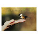 Photo of a bird in the hand...a chickadee in a woman's hand, with a quote from Shakespeare: "One touch of nature makes the whole world kin".