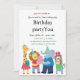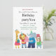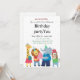 This cheerful birthday invitation card features adorable cartoon animals — a giraffe, lion, elephant, and monkey — all dressed for a party and holding colourful presents. With bright colours and a festive vibe, it's perfect for inviting friends to a fun and joyful birthday celebration.