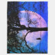 Fantastic full moon of purple hues and cobalt blue skies with a black cat on wire looking at it