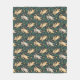 A blanket's front side features a repeating dinosaur pattern in earthy tones on a dark background. The back side is plain white with visible creases.