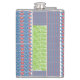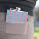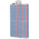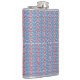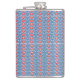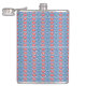 a blue background with red and white designs hip flask
