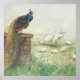 A Blue Peacock perched on a brick wall while he watches over his white peahen as she and her chicks feed in the grass