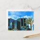 Blue skies and blue buildings in Phoenix, Arizona plus a green palm tree.