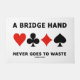 Showcase your wry bridge player side with this door mat featuring the four card suits along with the following bridge saying: "A Bridge Hand Never Goes To Waste". Make others do a double-take at every card they play with a dose of bridge attitude with this door mat. Perfect doormat for any bridge club!