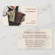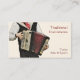 An accordian player dressed in folk costume with an accordian with red bellows. This business card template has a watercolour style image made from a photo of a French folk group.