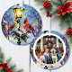 A beautiful Christmas ornament with an impasto style ai illustration of a female and male cardinal sitting on a lamppost on a snowy winter night. A back drop of a cute festive street and village. On the back of the ornament you can add your own custom message and family photo in the personalise area.