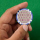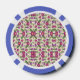 A casino chip features intricate floral patterns in pink, green, and purple on both sides, surrounded by a blue and white border, conveying elegance.