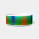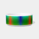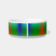 A ceramic bowl with a vibrant, rainbow gradient pattern in green, blue, and red hues on the exterior, set against a plain gray background.