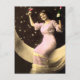 A funny vintage photograph of a young woman in a long gown sitting on a crescent moon and holding up champagne bottle in one hand and a glass of it in the other