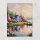 This a beautiful A.I. generated artwork, A charming lakeside cottage is surrounded by vibrant trees and blooming flowers, bathed in the soft glow of a sunset. The peaceful water reflects the house and sky, adding to the tranquil atmosphere. This serene scene captures the essence of a quiet retreat, inviting relaxation and calm.