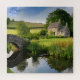 A charming stone cottage sits peacefully by a small stream, with a picturesque bridge arching over the water. Lush greenery and vibrant flowers surround the serene rural landscape under a bright blue sky.