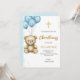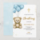 A christening invitation with a soft, pastel design features a teddy bear holding blue balloons, a gold cross, and elegant gold text on a white background.