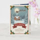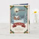 A Christmas card with snowy scenes, festive text, and a family around a decorated tree.