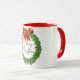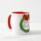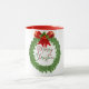 A Christmas mug with a Christmas wreath on it.